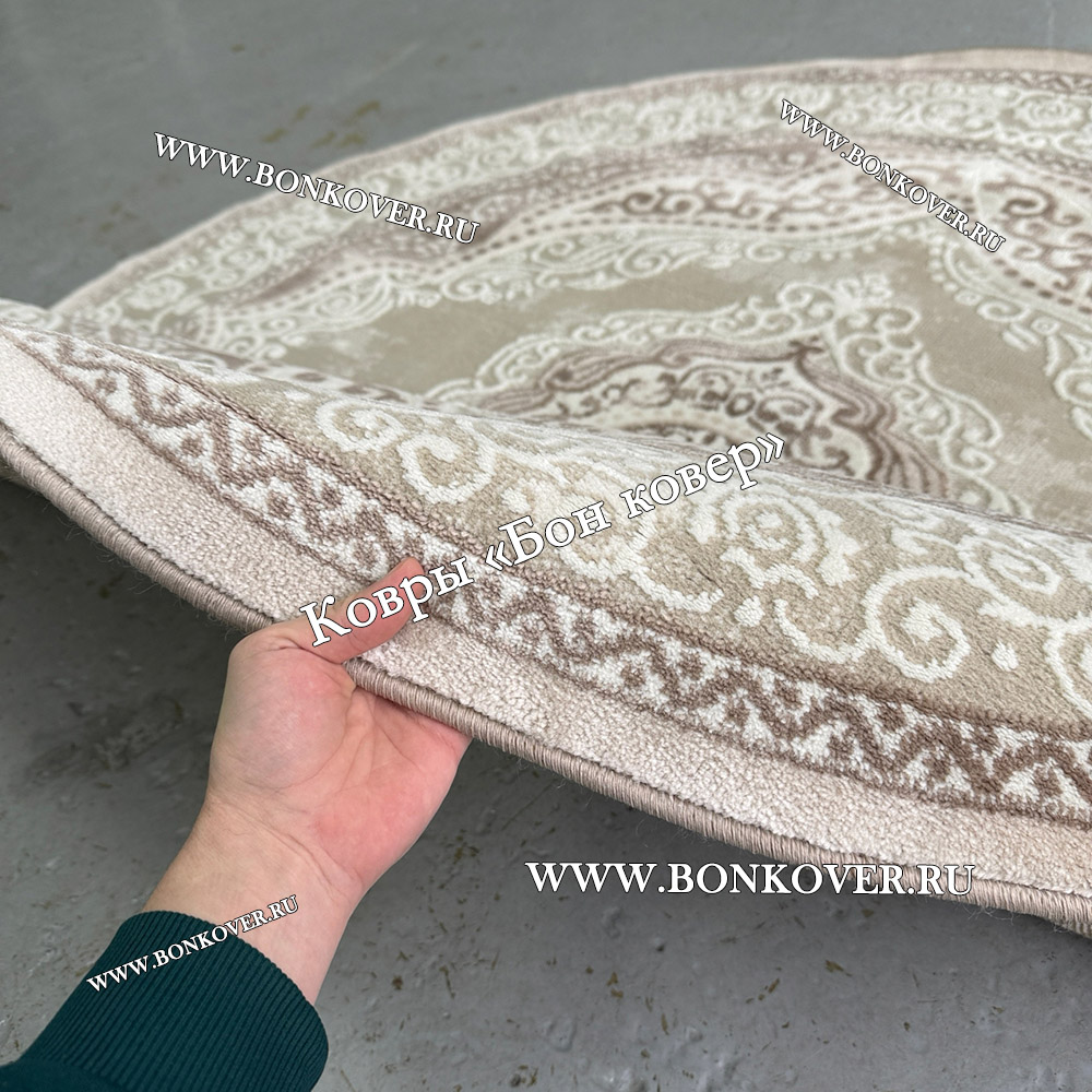 Изящный Круглый ковер в гостиную дизайн 02 Бежевый наполняет интерьер гостиной теплом и уютом, гармонично сочетает в себе изящество и красоту. Он выполнен из высококачественного сырья, комфортный и долговечный.